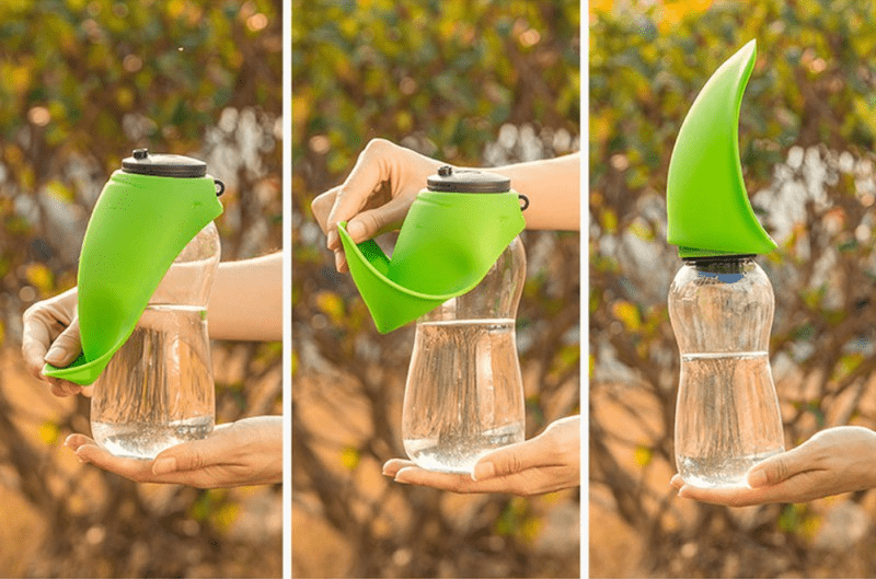🍃 Foldable Leaf Bowl: The high-quality, soft silicone bowl is foldable and lays flat over the bottle when not in use.