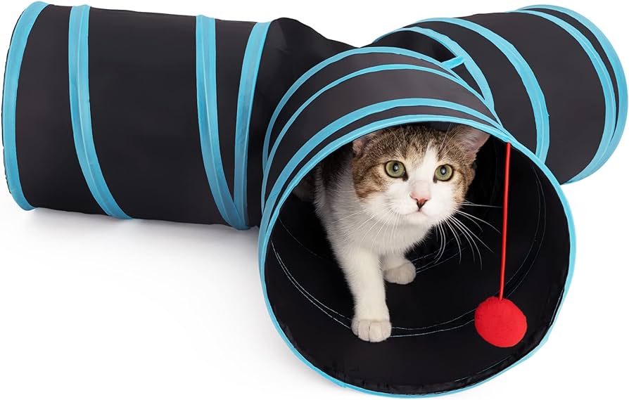 A delightful hideaway designed for feline friends who crave their own space, this interactive accessory features three connected tunnel sections made from flexible and collapsible materials.