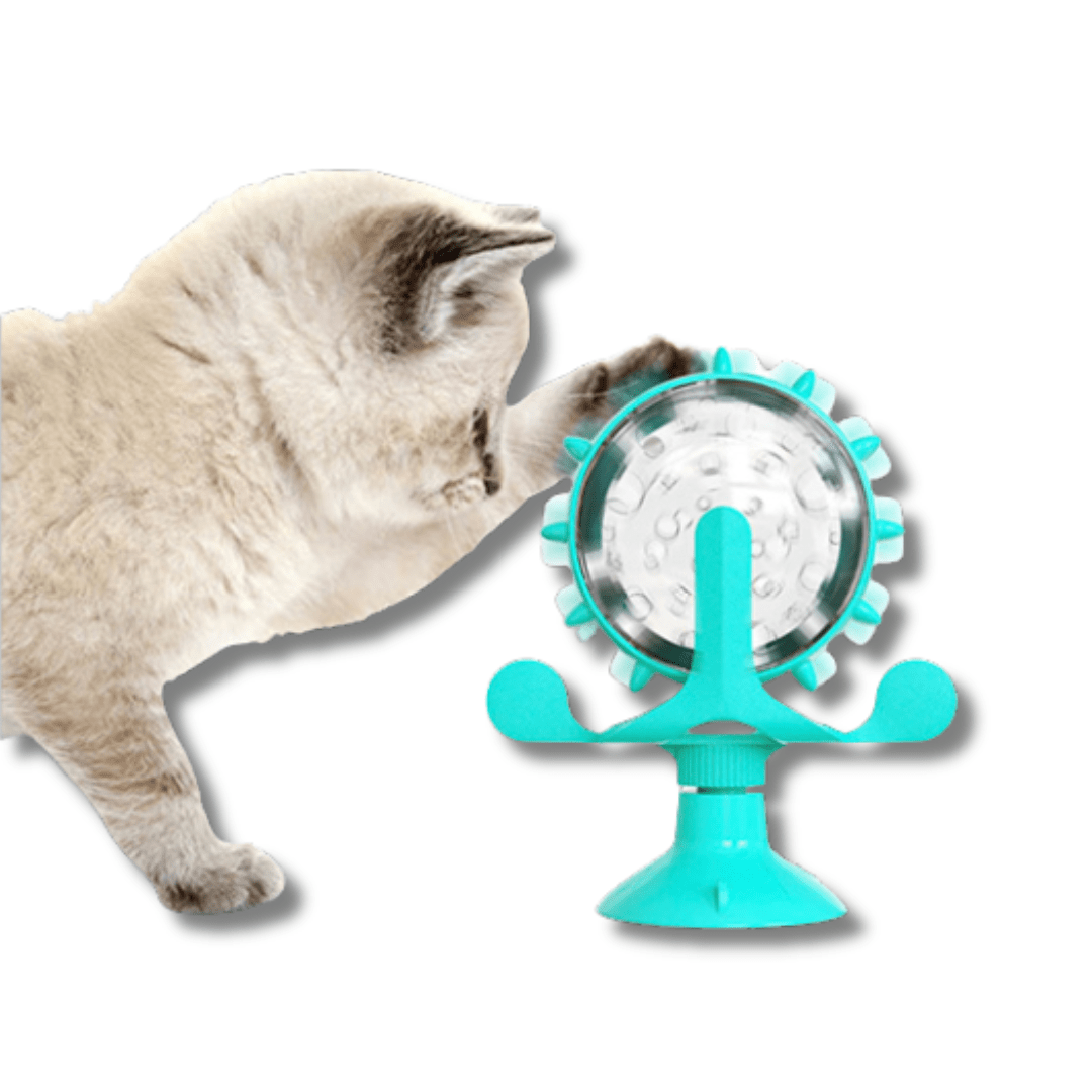 The design is inspired by windmills. This rotating windmill cat toy keeps the cat in motion and slowly dispenses rewarding snacks. This can stimulate your cat's mood and encourages their natural curiosity.