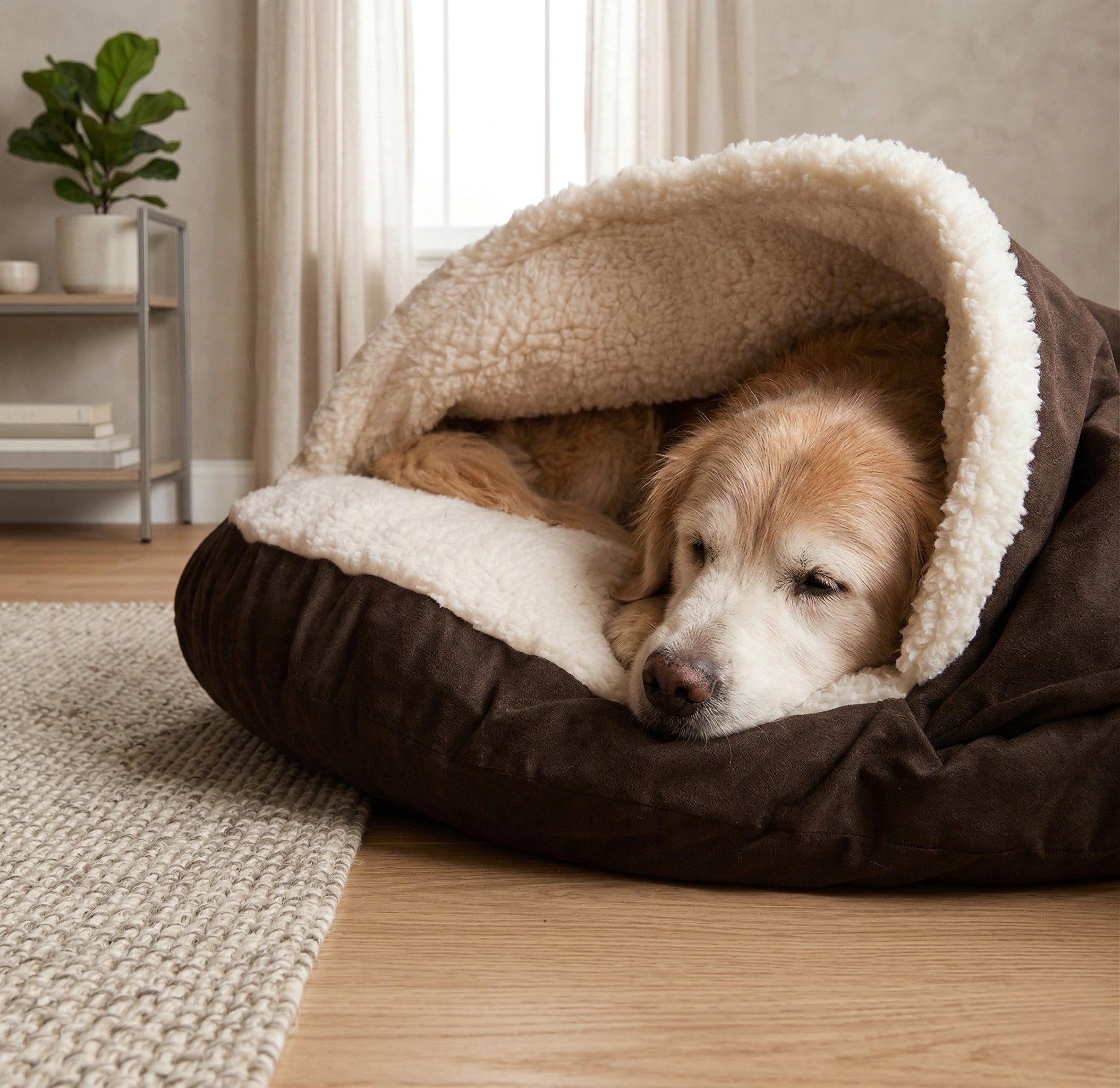 This unique bed features a hooded design that allows your dog to snuggle between layers of soft Sherpa lining, providing unparalleled comfort and coziness.