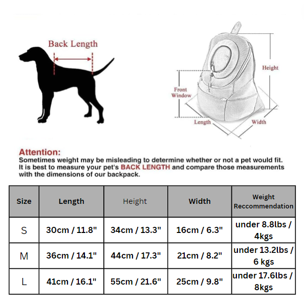 This backpack carrier is designed to carry small and medium-sized dogs/cats, and we highly recommend it for pets under 20LB (large dogs may be too much of a burden for their owners). Please measure your pet's BACK LENGTH and compare those measurements with the dimensions of our backpack.