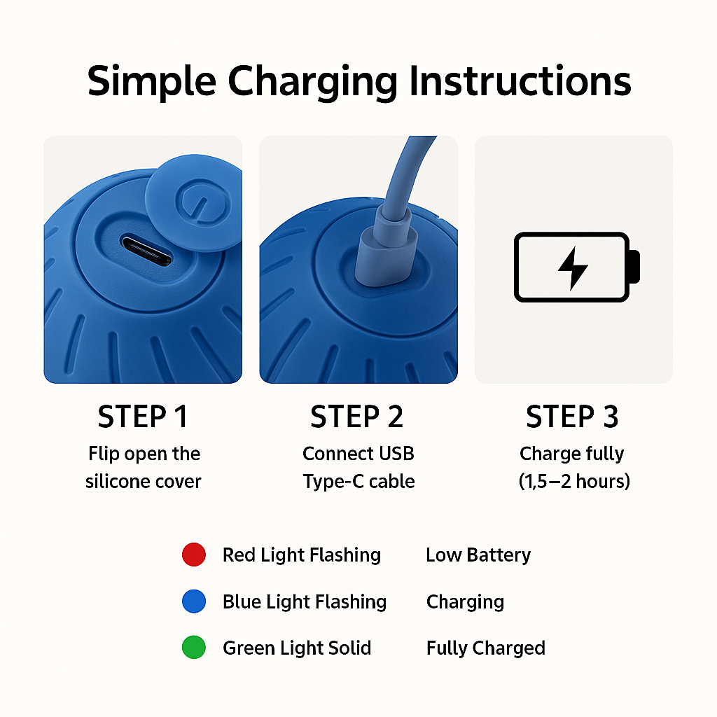 Charging your Buddies Bounce Ball is quick and simple — just flip open the silicone cover, plug in the USB Type-C cable, and you’re good to go.