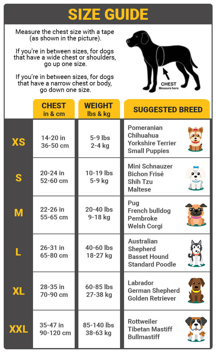 If you’re in between sizes or if your dog has a wide chest or broad shoulders, we recommend going up one size.